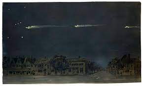 “As seen from western Ontario there suddenly appeared in the northwestern sky a fiery red or golden yellow body, which quickly grew larger as it approached and had attached to it a long tail. Observers vary in their descriptions as to whether the body was single or composed of three or four parts with a tail to each part. This body or group of bodies moved forward on an apparently perfectly horizontal path with peculiar, majestic, dignified deliberation and continuing its course without the least apparent sinking towards the earth. It moved on to the south-east, where it simply disappeared in the distance.
