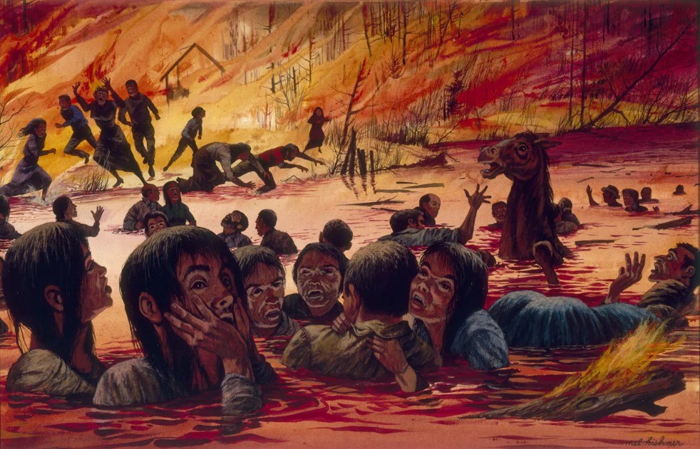 Peshtigo is a small town in Northeast Wisconsin. The record of that hideous fire is maintained in the town museum. Most of the eyewitness accounts come from the children who lived through the hell storm. Young Wesley Duket remembered it this way. These are his words: “When balls of fire started coming down from the sky, my mother and father took us to the spring and wrapped us in wet quilts. My sister saved the sewing machine by wrapping it up, too. We had a team of oxen. One of them stayed at the spring with us, and the other strayed away and burned. We had a shed of colts, and you could hear them thrashing as they burned. My brother wanted to open the shed door, but my sister was afraid he would burn to death too. My mother and father were (temporarily) blind. I went to see Mrs. Reinhart, our neighbor, and I found her dead. I liked her a lot and that really hurt me. Her shawl had not completely burned, and I took the corner that was left and kept it with me for many years.”