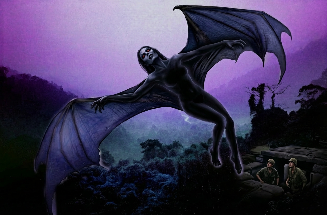 In 1969, a marine PFC named Earl Morrison and two of his friends were sitting on a bunker near Da Nang. They were watching for the enemy, when something unexpected happened. These are Morrison’s words as recorded by Keel: “All of a sudden, I don’t know why, we all three looked out in the sky and we saw this figure coming toward us. It had kind of a glow and we couldn’t make out what it was at first. It started coming toward us real slowly. All of a sudden we saw what looked like wings, like a bat’s only it was gigantic compared to what a regular bat would be. After it got close enough so we could see what it was, it looked like a woman. A naked woman. She was black, her skin was black, her body was black, the wings were black, everything was black, but it glowed. We saw her arms and they looked like regular molded arms, each with a hand and fingers and everything, but they had skin from the wings going over them. And when she flapped her wings there was no noise at first. It looked like her arms didn’t have any bones in them. Finally, she was right above us and when she got over the top of our heads she was maybe six or seven feet up. We couldn’t do anything. We didn’t know what to do. We just froze. She got ten feet or so away and we started hearing her wings flap. She just started flying off and we watched her for quite a while. The total time we saw her was between three and four minutes. End of quote. It is interesting that this apparition took a female form. Knowing combat soldiers, if it had been male, they would have shot at it. At least, that’s what my guys would have done.